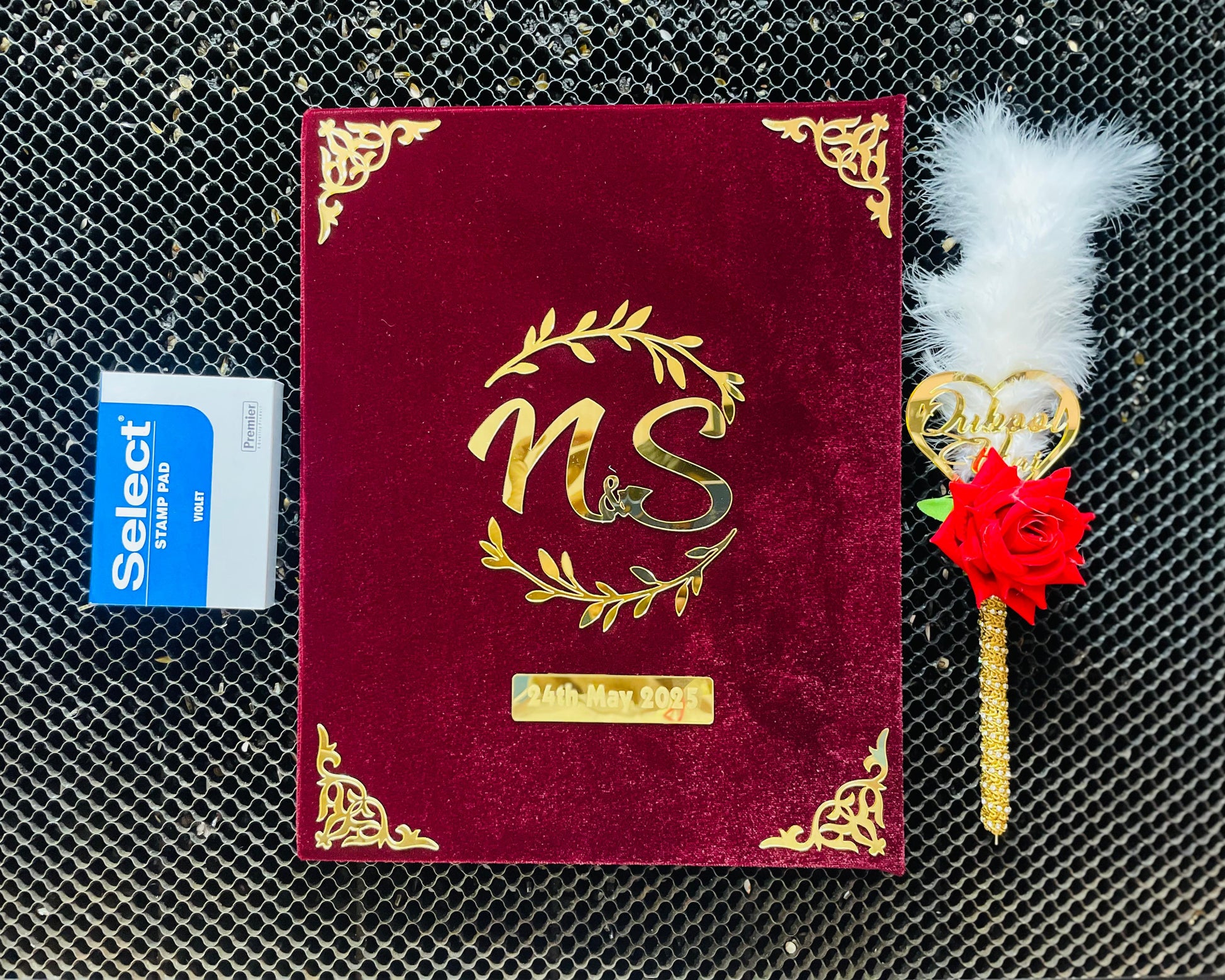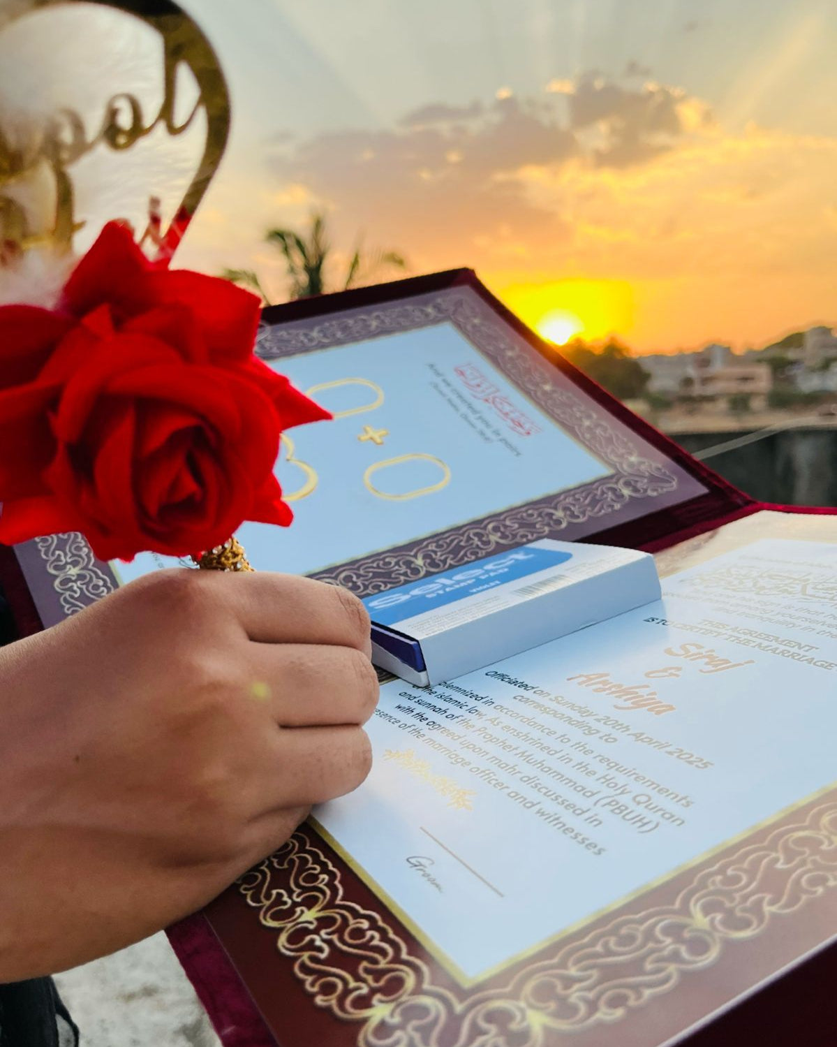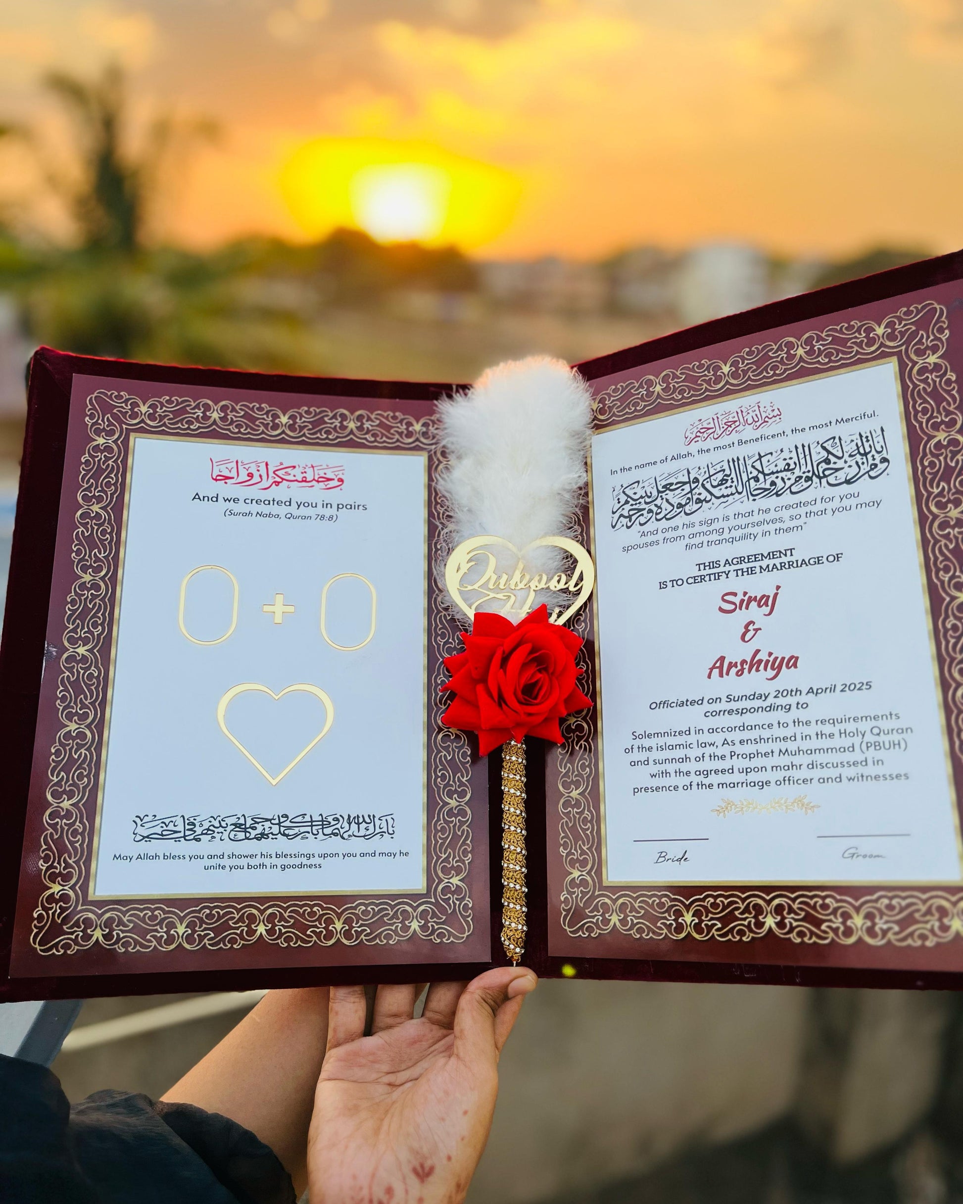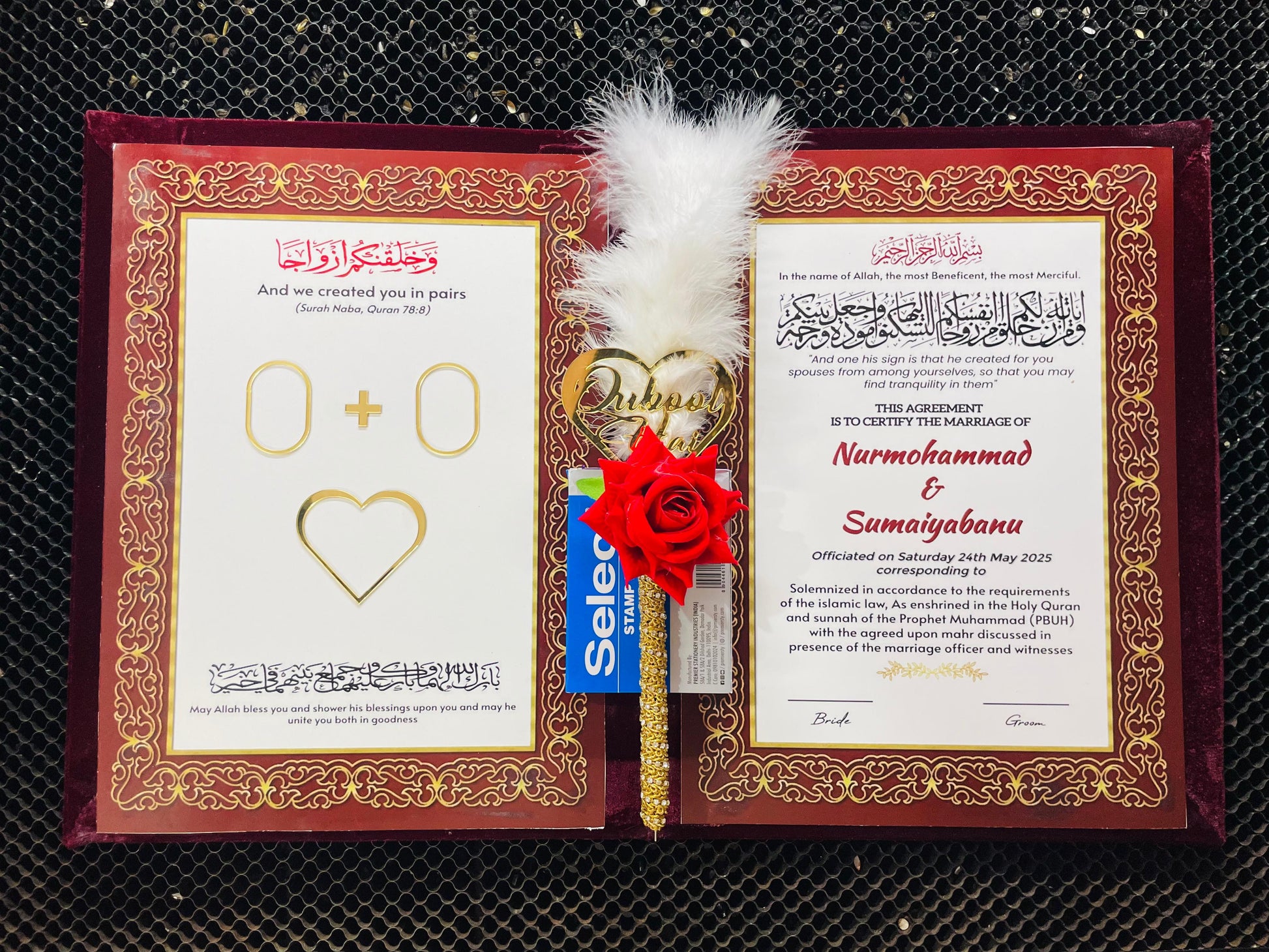 - Complete Nikah Ceremony Set – Includes a Nikah Namah (Marriage Certificate) a Nikah pen, and an inkpad for thumb impressions.
