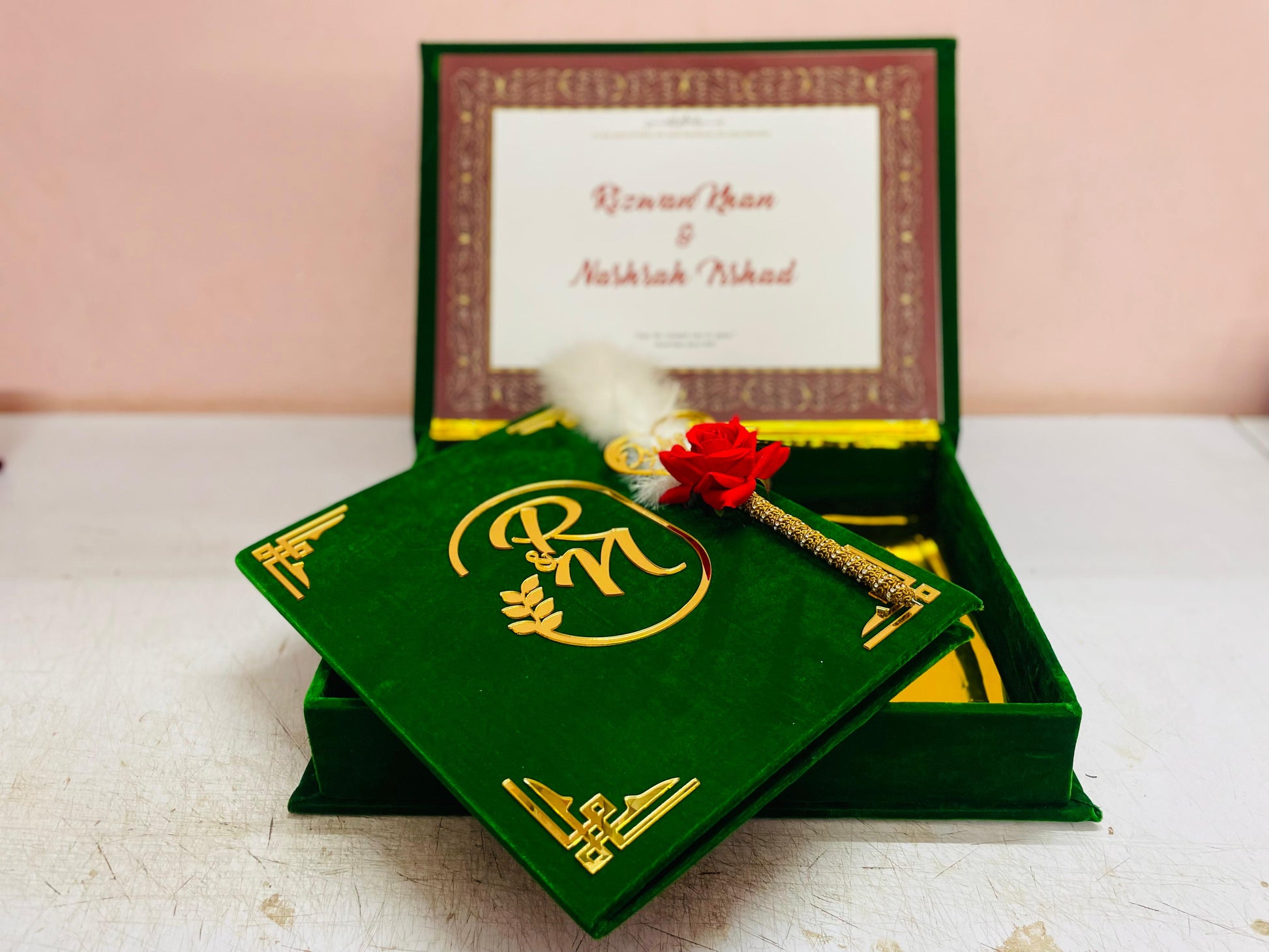 1 Luxurious Nikah Namah Box – Crafted with precision using 5mm WPC foam board and 5mm MDF sheet, wrapped in rich velvet cloth for a soft, elegant finish. Durable yet graceful, this box serves as a lasting keepsake for your matrimonial memories.